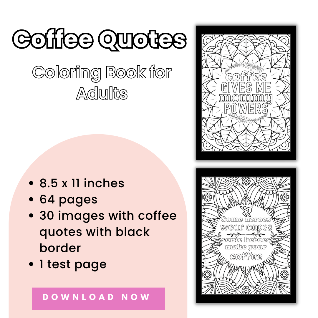 - 30 images with coffee quotes with black border to make them stand out after the coloring is done
